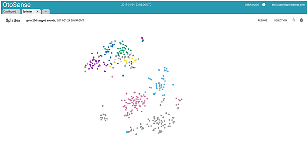 OtoSense Sound Platter(也稱為 splatter)允許通過完整概述數(shù)據(jù)集來探索和標(biāo)記聲音。Splatter 在完整的數(shù)據(jù)集中選擇最有趣和最具代表性的聲音,并將它們顯示為一個混合了標(biāo)記和未標(biāo)記聲音的 2D 相似性地圖。