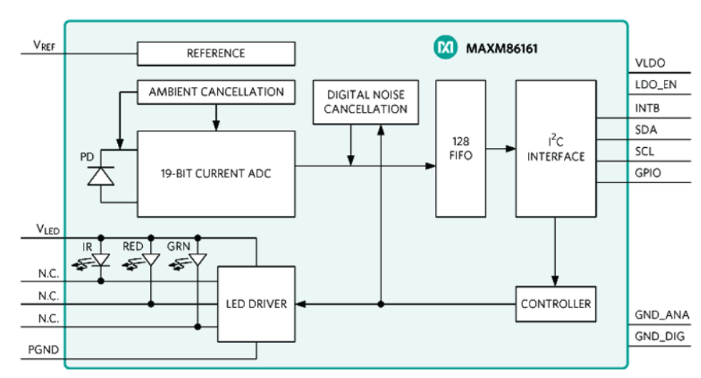 MAX86161入耳式心率監(jiān)測儀提供同類最佳的信噪比(SNR),可用于連續(xù)心率和血氧飽和度(SpO2)測量。它集成了三個可編程的高電流LED驅(qū)動器,但只需要3.0到5.5 V的單個電壓源。接收器使用帶光學(xué)讀出通道的高效PIN光電二極管。該通道具有低噪聲信號調(diào)理模擬前端(AFE),由19位ADC和環(huán)境光消除(ALC)電路組成,支持柵欄檢測和替換算法。