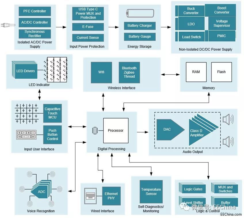 但相比于與互聯(lián)網接口結合使用的麥克風和揚聲器, 這些外形看似簡單的設備往往更復雜。智能音箱包含許多電子功能,這些功能均通過采用數(shù)十種復雜的集成電路(IC) 來實現(xiàn)。原始設備制造商 (OEM) 憑借差異化產品進入智能揚聲器市場,他們必須決定要提供哪些設備、如何進行提供以及此類小型低功耗設備中可采用的折衷方案。