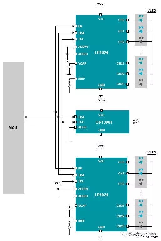 如圖 6 所示,各種LED 環(huán)形燈照明圖案參考設計說明了如何使用裝有集成式LED 引擎的新型多通道RGB LED 驅動器設計多色RGB LED 環(huán)形燈圖形子系統(tǒng)。使用環(huán)境光傳感器 IC 可自動控制LED 亮度。