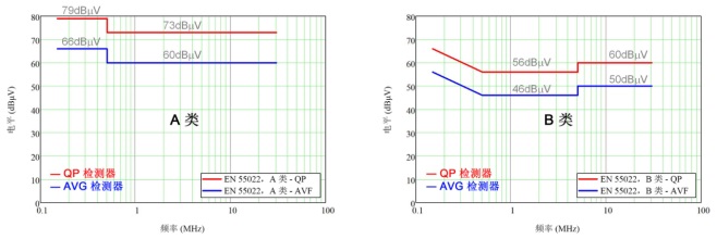 圖 1:使用準峰值和平均值檢測器的 EN 55022 A 類和 B 類傳導發(fā)射限值。