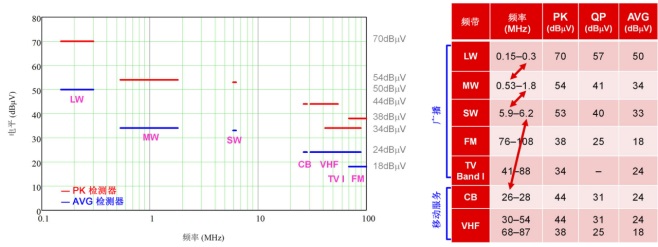 CISPR 25 測試的傳導發(fā)射均在 150kHz 至 108MHz 頻率范圍的特定頻帶內進行測量。具體而言,調節(jié)頻率范圍分布在 AM 廣播、FM 廣播和移動服務頻帶之間,如圖 2 中的圖象和表格所示。圖 2 還繪制了 CISPR 25 5 類(最嚴苛的要求)的相關限值圖象。盡管頻帶之間的帶隙允許更高的噪聲尖峰,但汽車制造商可能會根據(jù)其特定的內部 EMC 要求選擇擴展這些頻率范圍。這些要求通;趪H IEC 標準,僅更改不同測試或限值的少量參數(shù),其核心內容保持不變。