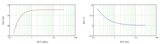 圖 4:在 150kHz 至 30MHz 的調節(jié)頻率范圍內,測量端口處的 50Ω,50μH LISN 標稱阻抗特性。