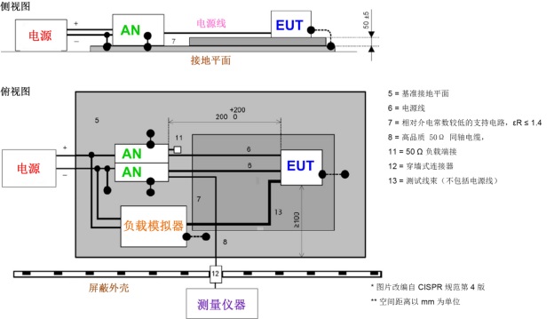 AN 直接安裝在基準接地平面之上,AN 外殼與接地平面相連。電源回流線還與電源和 AN 之間的接地平面相連。將 EMI 接收器連接到相應 AN 的測量端口可確保成功測量每條電源線上的傳導發(fā)射。與此同時,插入另一條電源線的 AN 的測量端口端接 50Ω 負載。