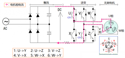 下圖表示了無刷電機梯形波控制算法的基本原理。首先,交流電整流為直流電壓,后級為變頻部分(inverter),包含6個開關(guān)器件(FET):上橋臂的U、V、W和下橋臂的X、Y、Z。