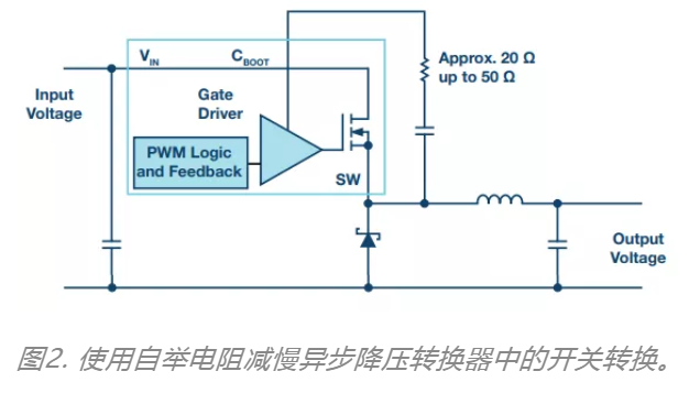 圖1顯示了快速和慢速開(kāi)關(guān)轉(zhuǎn)換?焖匍_(kāi)關(guān)轉(zhuǎn)換會(huì)給鄰近電路段產(chǎn)生更強(qiáng)的干擾耦合。存在電壓突變的PCB走線可與具有高阻抗的鄰近走線產(chǎn)生容性耦合。存在電流突變的PCB走線可與鄰近走線產(chǎn)生電感耦合。通過(guò)減慢開(kāi)關(guān)轉(zhuǎn)換,可將這些影響降至最低。圖2顯示了一種經(jīng)驗(yàn)證適用于異步開(kāi)關(guān)調(diào)節(jié)器的技術(shù)。此處,兩個(gè)開(kāi)關(guān)中的一個(gè)使用了肖特基二極管。將電阻與自舉電容CBOOT(提供高邊n溝道MOSFET的柵極電壓)串聯(lián),可減慢開(kāi)關(guān)的開(kāi)關(guān)轉(zhuǎn)換。當(dāng)無(wú)法直接調(diào)整功率MOSFET的柵極信號(hào)線時(shí),此技巧可用于集成開(kāi)關(guān)調(diào)節(jié)器。如果將開(kāi)關(guān)控制器與外部MOSFET配合使用,也可將電阻插入柵極驅(qū)動(dòng)走線中。電阻值通常小于100Q。