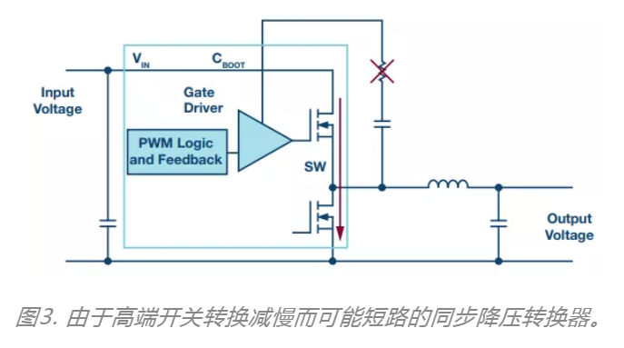 但是,大多數(shù)現(xiàn)代開(kāi)關(guān)調(diào)節(jié)器都是具有高邊和低邊有源開(kāi)關(guān)的同步開(kāi)關(guān)調(diào)節(jié)器。此處,在CBOOT路徑中使用電阻無(wú)法明顯減慢開(kāi)關(guān)轉(zhuǎn)換。如果此處還是使用與CBOOT串聯(lián)的電阻(如圖3所示),則也將減慢高邊開(kāi)關(guān)的開(kāi)關(guān)轉(zhuǎn)換。但是,這可能導(dǎo)致低邊開(kāi)關(guān)沒(méi)有完全關(guān)閉。因此,高邊開(kāi)關(guān)和低邊開(kāi)關(guān)可能同時(shí)瞬間打開(kāi)。這將導(dǎo)致輸入電壓到接地之間出現(xiàn)破壞性短路。這一點(diǎn)尤為關(guān)鍵,因?yàn)殚_(kāi)關(guān)轉(zhuǎn)換速度也受到工作溫度等參數(shù)和半導(dǎo)體制造中的可變性的影響。因此,即使是在實(shí)驗(yàn)室測(cè)試,也無(wú)法保證安全操作。要減慢具有集成開(kāi)關(guān)的同步開(kāi)關(guān)調(diào)節(jié)器的開(kāi)關(guān)轉(zhuǎn)換,應(yīng)使用可通過(guò)內(nèi)部電路直接設(shè)置開(kāi)關(guān)轉(zhuǎn)換速度的同步開(kāi)關(guān)調(diào)節(jié)器,例如ADI的ADP5014。在這些集成電路中,可在內(nèi)部確保:在減慢開(kāi)關(guān)轉(zhuǎn)換時(shí),兩個(gè)開(kāi)關(guān)不同時(shí)導(dǎo)通,因此也不會(huì)發(fā)生短路,并且在CBOOT路徑中都沒(méi)有電阻。