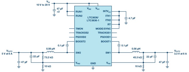 設(shè)計人員面臨的問題不僅僅是找到一個在有限空間放得下的穩(wěn)壓器。緊湊型解決方案的要求往往與其他先進的電子產(chǎn)品要求相沖突:可靠的設(shè)計、高效率、大轉(zhuǎn)換比、高功率、小尺寸以及良好的熱性能。其中許多要求需要在其他領(lǐng)域進行權(quán)衡,這就給設(shè)計人員帶來了一個困難且耗時的優(yōu)化問題。LTC3636旨在通過雙通道6 A降壓穩(wěn)壓器簡化設(shè)計人員的任務(wù),該穩(wěn)壓器在關(guān)斷時消耗非常低的待機電流,在高達4 MHz的頻率下工作時,滿載和輕載時都具有很高的效率。