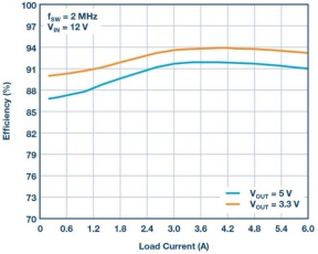 LTC3636穩(wěn)壓器具有低靜態(tài)電流,可在輸出電壓高達5 V時實現(xiàn)高效率。而LT3636-1型號將VOUT范圍擴大至12 V。該降壓穩(wěn)壓器能夠在3.1 V至20 V的輸入電壓范圍內(nèi)工作,同時每通道提供高達6 A的輸出電流。圖3顯示的是一個高效率解決方案,而圖4顯示,其測得的效率在整個工作范圍內(nèi)一直很高。