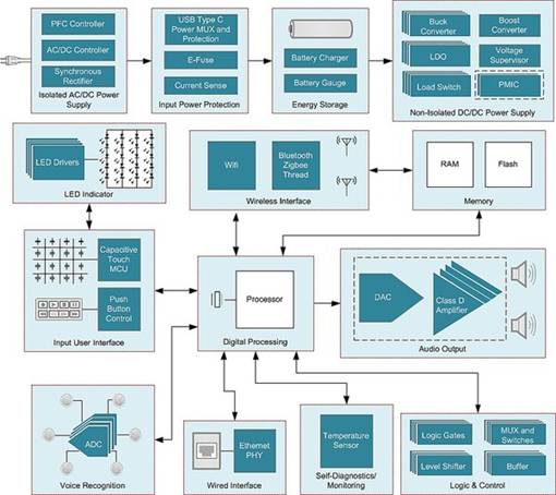 由于這些音箱通常放置在床頭柜或書桌上,交流電源可輕松獲得,因此電池電源并非是必不可少的。但是,考慮到這些音箱的位置,增加電池充電功能則具有重要意義,可以通過USB或無線方式為智能手機(jī)和智能手表充電。最后,消費(fèi)者需要可以在這些位置連接并控制燈光、恒溫器和安防系統(tǒng)。