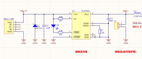 這款TC4056A也是市面上比較常見的一款單節(jié)鋰電池充電管理芯片,充電電壓固定在4.2V,最大充電電流可大1A,同時自帶鋰電池溫度檢測、欠壓閉鎖、自動再充電和兩個用于指示充電、結束的LED狀態(tài)引腳。眼尖的高手們或許發(fā)現了筆者電路上的一個問題,那就是,鋰電池充電部分并沒有帶保護電路,是不是有安全隱患?其實不然,因為筆者使用的電池是鋁包電池,而非18650那種鋰電池,這種鋁包電池本身就已經帶了保護板,所以筆者也就沒有再多此一舉了,那樣也浪費物料。
