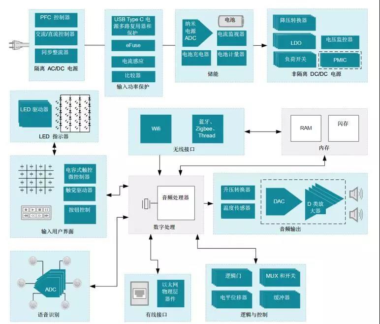 大多數(shù)電路板上集成了直接影響用戶體驗(yàn)的關(guān)鍵組件,如片上音頻系統(tǒng)、帶觸覺(jué)反饋的電容式觸摸的人機(jī)接口控制器,以及LED驅(qū)動(dòng)器引擎和D類(lèi)音頻放大器。智能音箱系統(tǒng)中的其他組件(如電源管理)執(zhí)行的任務(wù)不會(huì)直接影響用戶體驗(yàn),但會(huì)影響尺寸和成本。設(shè)計(jì)人員可以在減小這些組件尺寸的同時(shí),繼續(xù)提升其性能。