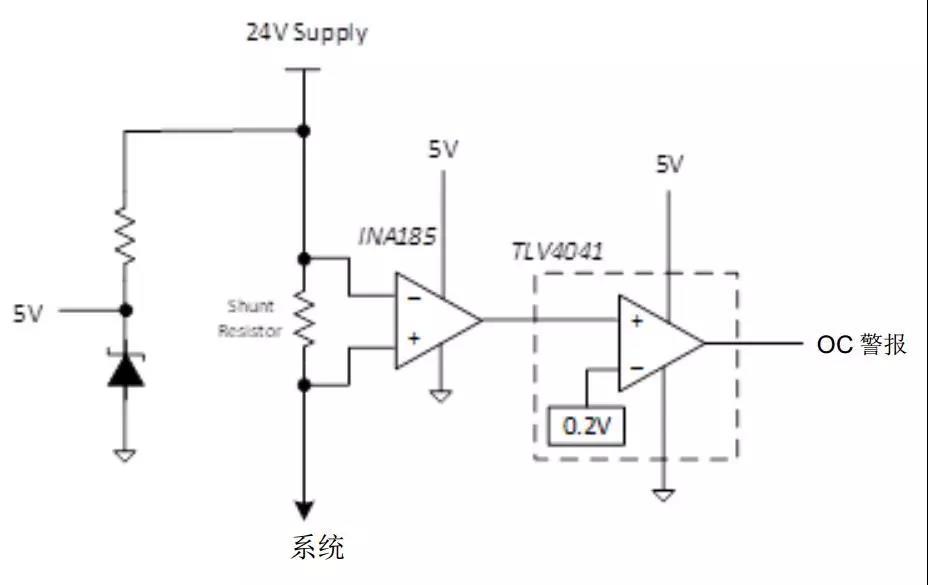 圖3:如何設(shè)置INA185和TLV4041以生成高壓系統(tǒng)OCP警報(bào)信號(hào)的功能電路