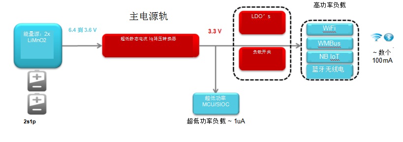 例如,假設(shè)有兩節(jié)鋰-二氧化錳(Li-MnO2)電池為智能電表供電。Li-MnO2電池是一次性非充電電池,由于使用壽命較長(zhǎng)(長(zhǎng)達(dá)20年),再加上比鋰亞硫酰氯電池更具成本效益,其在智能電表或水表中的應(yīng)用日益廣泛。
