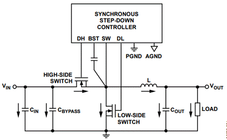 圖1所示為一個同步降壓調(diào)節(jié)器設(shè)計(jì),它包括一個開關(guān)控制器和以下外部電源器件:高端開關(guān)、低端開關(guān)、電感、輸入電容、輸出電容和旁路電容。圖1中的箭頭表示高開關(guān)電流流向。必須小心放置這些電源器件,避免產(chǎn)生不良的寄生電容和電感,導(dǎo)致過大噪聲、過沖、響鈴振蕩和接地反彈。