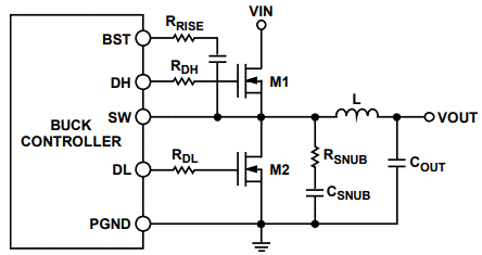 在DH或DL引腳上串聯(lián)一個小電阻(約2 Ω至4 Ω)可以減慢柵極驅(qū)動,從而也能降低柵極噪聲和過沖。另外,BST與SW 引腳之間也可以連接一個電阻(參見圖6)。在布局期間用0 Ω柵極電阻保留空間,可以提高日后進(jìn)行評估的靈活性。增加的柵極電阻會延長柵極電荷上升和下降時間,導(dǎo)致 MOSFET的開關(guān)功率損耗提高。