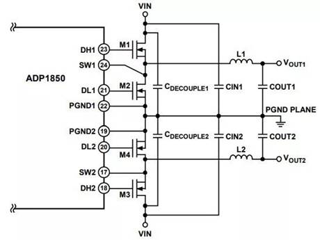 作為例子的開關(guān)調(diào)節(jié)器布局采用雙通道同步開關(guān)控制器 ADP1850,第一步是確定調(diào)節(jié)器的電流路徑。然后,進(jìn)行物理規(guī)劃和電源器件的考慮。此外,我們需要了解一點(diǎn):電流路徑?jīng)Q定了器件在該低噪聲布局布線設(shè)計(jì)中的位置。