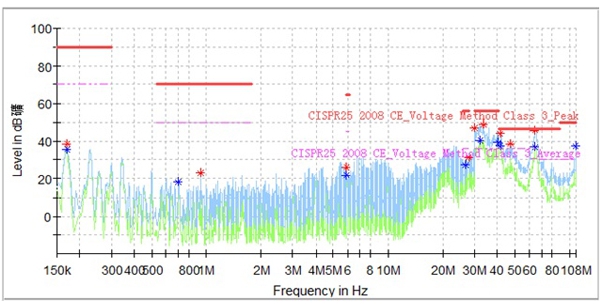 地環(huán)路干擾產(chǎn)生的內(nèi)在原因是地環(huán)路電流的存在,地環(huán)路電流是因?yàn)閮蓚(gè)接地點(diǎn)的電位不同形成電壓導(dǎo)致的。常用的解決地環(huán)路干擾問(wèn)題的方法有單點(diǎn)接地,采用隔離變壓器或光耦隔離器隔離,安裝共模扼流圈增加地環(huán)路阻抗等。在本整改測(cè)試試驗(yàn)中,只需要將增加的接地點(diǎn)遠(yuǎn)離DCDC輸出線,保證兩個(gè)接地點(diǎn)的電位相近,就可以避免和減弱地環(huán)路干擾。如圖7    所示,將增加的接地點(diǎn)布置在機(jī)器的另一側(cè),遠(yuǎn)離干擾輸出端,就可以避免6.1M超標(biāo)同時(shí)抑制32M、41M和65M干擾點(diǎn),如圖8所示,結(jié)合其他措施,就可以通過(guò)傳導(dǎo)發(fā)射試驗(yàn)。