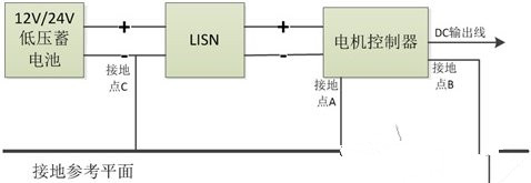 圖6、測(cè)試系統(tǒng)模型圖(接地點(diǎn)C是測(cè)試標(biāo)準(zhǔn)要求的:低壓蓄電池負(fù)極接地)