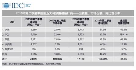 IDC《中國可穿戴設(shè)備市場季度跟蹤報告,2019年第二季度》顯示,2019年第二季度中國可穿戴設(shè)備市場出貨量為2307萬臺,同比增長 34.3%。基礎(chǔ)可穿戴設(shè)備(不支持第三方應(yīng)用的可穿戴設(shè)備)出貨量為1846萬臺,同比增長31.9%,智能可穿戴設(shè)備出貨量為461萬臺,同比增長45.0%。