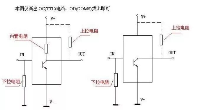 另外,當(dāng)要求這個節(jié)點為高電平時,這個節(jié)點和地之間的阻抗一般非常大,如100K歐的阻抗,當(dāng)上拉一個10K歐的電阻,這個點分得的電壓為100K歐/(100K+10K)*5V=4.5V,這樣也可以拉到高電平。