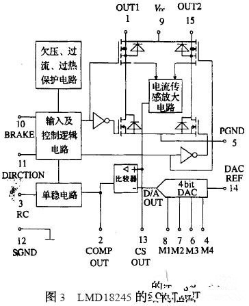 LMD18245 的內(nèi)部結(jié)構(gòu)框圖如圖3 所示。9 腳是電源端; 1、15 腳功率橋的輸出端; 12、5 腳分別是信號地和功率電路接地端; 4、6、7、8 是D/ A 轉(zhuǎn)換器的二進制數(shù)據(jù)輸入端, 其中4 腳為二進制數(shù)的最高位;10腳是緊急停止控制端,高電平有效; 11 腳為方向邏輯輸入端;3 腳上聯(lián)接一個并聯(lián)的RC 網(wǎng)絡(luò),可將單穩(wěn)脈沖寬度設(shè)置為: 1. 1 RC 秒。此外, 該芯片還提供了電流傳感器放大輸出端(13 腳) ,比較信號輸出端(2 腳) ,和數(shù)模轉(zhuǎn)換參考電壓輸入端(14 腳) 。