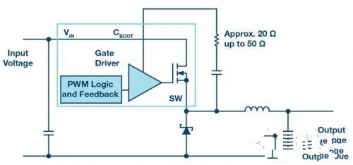 圖 2. 使用自舉電阻減慢異步降壓轉(zhuǎn)換器中的開關(guān)轉(zhuǎn)換。