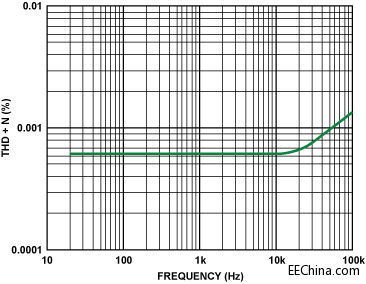 圖2顯示整個音頻范圍內(nèi)的總諧波失真及噪聲。誤差隨頻率提高而變大,但20 kHz時總誤差仍然小于0.0007%。圖3給出了該IC的連接圖。