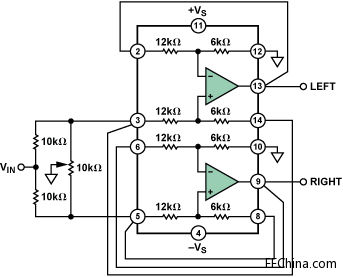 本電路中,信號通過10 kΩ串聯(lián)電阻在兩個放大器之間分配。兩個同相輸入端之間插入一個游標(biāo)接地的電位計。電位計和10 kΩ電阻的組合構(gòu)成一個輕負(fù)載,很容易被大多數(shù)信號源驅(qū)動。放大器的增益配置為3。當(dāng)電位計游標(biāo)位于任一端時,一個輸入端接地,因此不會有信號傳送至對應(yīng)的輸出端。另一輸入端的