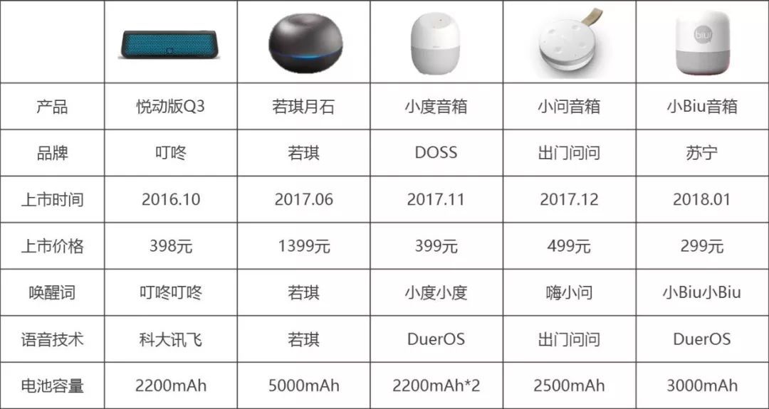 2016年10月,叮咚發(fā)布靈動版A3和悅動版Q3,其中Q3內(nèi)置2200mAH電池,可連續(xù)播放8小時,同時搭配Flash charging快充技術(shù)。2017年,帶電池的便攜音箱逐漸增多,包括若琪的月石、DOSS的小度音箱、出門問問的小問音箱等。進入2018年,蘇寧發(fā)布小Biu智能音箱,搭載DuerOS2.0,配備3000mAh大容量鋰電池,在沒有電源的情況下可連續(xù)工作6小時。