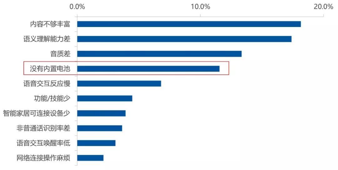 根據(jù)奧維云網(wǎng)(AVC)挖掘的主流電商平臺重點智能音箱品牌的消費者評價數(shù)據(jù)顯示,不帶電池的差評占比達到11.6%,排在第四位。沒有內(nèi)置電池,意味著只能插電使用,不能自由移動及隨身攜帶,使用場景大大受到限制。從機型看,小巧的機型在沒有電池方面的差評要高于其他機型。