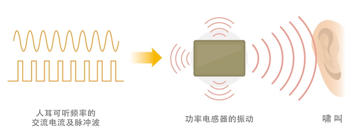 1. 間歇工作、頻率可變模式、負(fù)荷變動(dòng)等可能導(dǎo)致人耳可聽(tīng)頻率振動(dòng)聲波是在空氣中傳播的彈性波,人的聽(tīng)覺(jué)可聽(tīng)到大約20~20kHz頻率范圍的"聲音"。在DC-DC轉(zhuǎn)換器的功率電感器中,當(dāng)流過(guò)人耳可聽(tīng)范圍頻率的交流電流 以及脈沖波時(shí),電感器主體會(huì)發(fā)生振動(dòng),該現(xiàn)象稱為"線圈噪音",有時(shí)也會(huì)被聽(tīng)成嘯叫現(xiàn)象(圖1)。
