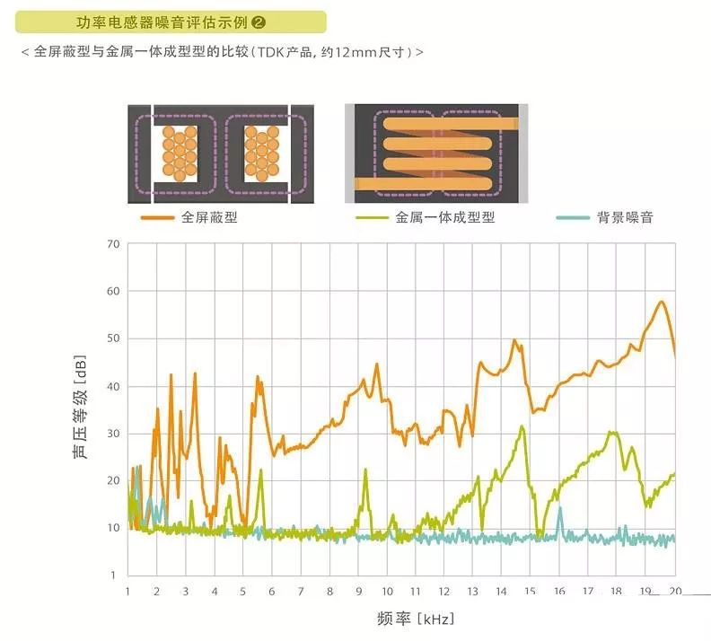 比較全屏蔽型與金屬一體成型型產(chǎn)品時(shí),其中的差異較為顯著。全屏蔽型中,在大范圍的頻帶內(nèi)產(chǎn)生有30~50dB左右水平的噪音。而在金屬一體成型型中,在大范圍頻帶內(nèi),其與背景噪音處于同等低的水平,即使在峰值部位,其與全屏蔽型相比也抑制了大約20dB。抑制20dB也就意味著僅為10分之1的水平,由此可見(jiàn),置換為金屬一體成型型是有效的對(duì)策。