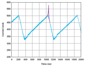 圖3.電感電流的測(cè)量結(jié)果顯示為藍(lán)色,飽和電感的行為顯示為附加的紫色。