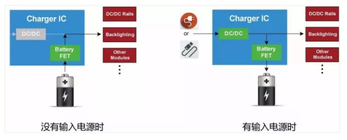 充電IC是基于電池和系統(tǒng)負(fù)載之間的連接方式的不同,系統(tǒng)負(fù)載可以由輸入電源供電,也可以由電池供電,或者由兩者同時供電。那么電池IC就必須具備功率管理功能,來實現(xiàn)系統(tǒng)負(fù)載功率來源的選擇。