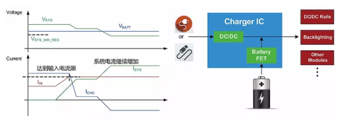 在以上的充電過程中,當(dāng)總的系統(tǒng)負(fù)載需求超過輸入電源的能力時,系統(tǒng)母線電壓會下跌,充電IC就會減少充電電流以保證總的負(fù)載功率不再繼續(xù)增加,從而穩(wěn)定系統(tǒng)電壓不再下跌,維持系統(tǒng)負(fù)載的平穩(wěn)運行。