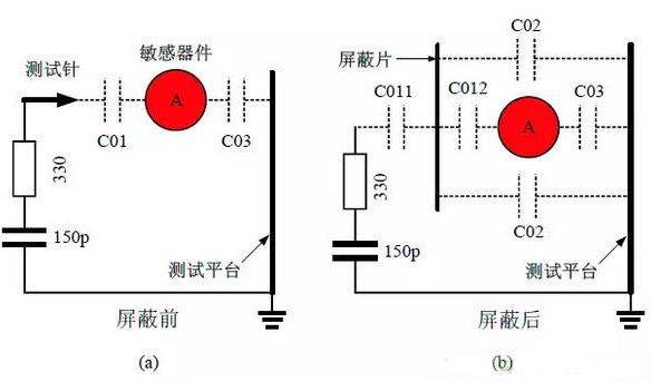 這里需要特別說明的是,對ESD進(jìn)行靜電屏蔽防護(hù)的金屬屏蔽片是可以不需要接地的。經(jīng)屏蔽之后,在屏蔽片與大地之間就會增加一個(gè)分布電容C02,C02對C011 在C012、C03 產(chǎn)生的電壓起到分壓作用,因此,C02 與C012、C03 之比,越大越好,而C01=C011+C012=2C012(假說C011=C012)。加大C02 要盡量加大屏蔽片的有效面積,而減小C01,則應(yīng)該盡量讓A 遠(yuǎn)離測試探頭和機(jī)殼,并把敏感器件A 置于公共地的包圍圈之中。金屬屏蔽片一般選用如過濾嘴香煙包裝盒中的錫箔片最為簡便。