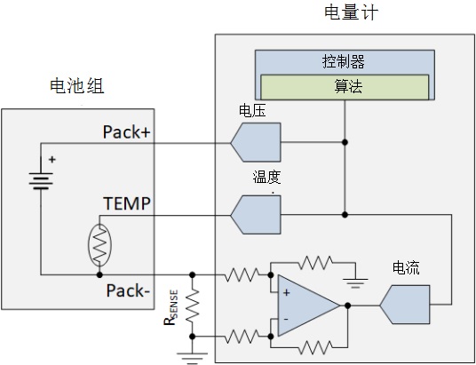 圖1:帶外部電流檢測放大器和控制器測量的電量計(jì)