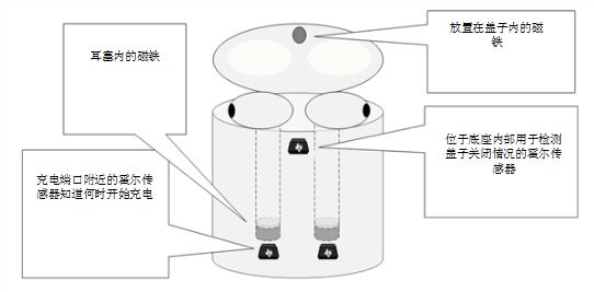 霍爾效應(yīng)傳感器能夠很好地應(yīng)用于檢測充電盒蓋和耳塞充電情況。鑒于磁鐵已用來合上充電盒蓋,因此,以霍爾效應(yīng)開關(guān)的形式使用磁感測解決方案檢測蓋子顯然是一種無需額外零件即可之際連接/斷開藍(lán)牙的解決方案。此外,將磁鐵放進(jìn)在耳塞,是一種能夠檢測充電盒內(nèi)是否存在耳塞的從而有效充電方法。