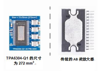 圖3:TPA6304-Q1D類放大器解決方案與AB類放大器的尺寸比較