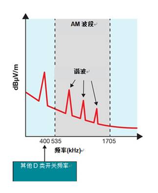 如圖4所示,在400-kHz范圍內(nèi)開(kāi)關(guān)的傳統(tǒng)D類放大器產(chǎn)生直接位于AM波段內(nèi)的諧波。這些諧波會(huì)產(chǎn)生降低AM接收器靈敏度的干擾信號(hào),從而妨礙AM廣播電臺(tái)接收。因此,必須在這些400-kHz D類放大器設(shè)計(jì)上實(shí)施某種類型的EMI避免技術(shù),以減輕這些AM波段諧波的影響。