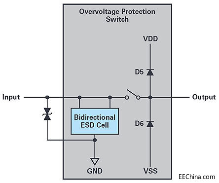 圖2.配有集成式雙向ESD單元的過壓保護(hù)