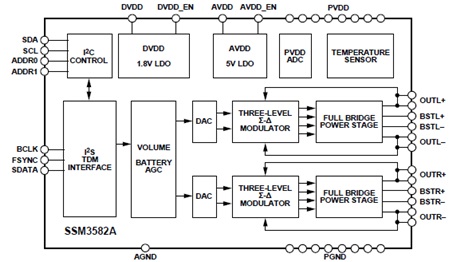 The SSM3582A is a fully integrated, high efficiency, digital input stereo Class-D audio amplifier. The device can operate from a single supply and requires only a few external components, significantly reducing the circuit bill of materials.