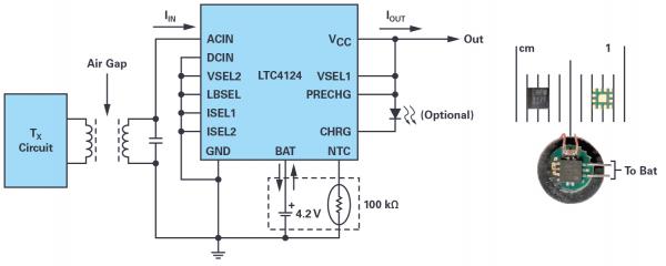 對于小尺寸便攜式和可穿戴設備而言,無線充電正變得越來越流行。這不足為奇。設備沒有裸露的連接器和端口將更加可靠,最終用戶體驗也更輕松簡便。為了克服這些設備(如助聽器)帶來的空間限制問題,LTC4124集成了無線功率管理器,它將來自無線諧振電路的交流電壓轉換為穩(wěn)定的直流電壓。然后,該直流電壓會饋入功能齊全的線性電池充電器中,以提供良好的電池充電功能。有著如此高的集成度,僅需添加一個接收器諧振電路和電池本身,即可實現非常小巧且功能齊全的無線充電裝置。