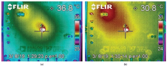 圖4.熱性能比較:(a) 4.1 V輸出時100 mA充電電流,(b) 4.2 V輸出時10 mA充電電流。