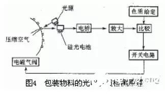 圖4為包裝物料的光電色質檢測原理。若包裝物品規(guī)定底色為白色,因質量不佳,有的出現(xiàn)泛黃,在產(chǎn)品包裝前先由光電檢測色質,物品泛黃時就有比較電壓差輸出,接通電磁閥,由壓縮空氣將泛黃物品吹出。
