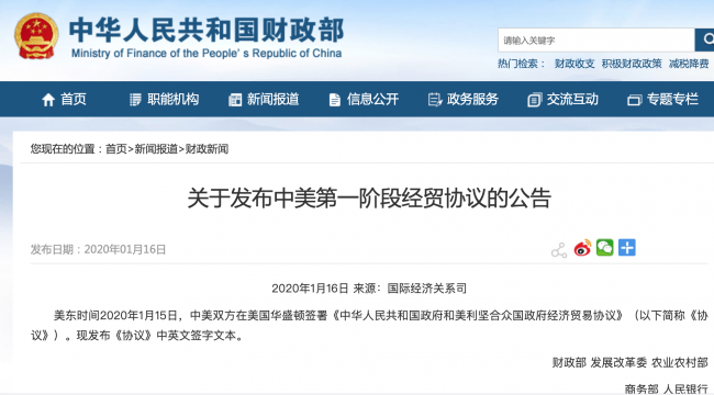 美東時(shí)間2020年1月15日,中美雙方在美國(guó)華盛頓簽署《中華人民共和國(guó)政府和美利堅(jiān)合眾國(guó)政府經(jīng)濟(jì)貿(mào)易協(xié)議》(以下簡(jiǎn)稱《協(xié)議》)。今天,財(cái)政部發(fā)布了《協(xié)議》中英文簽字文本。