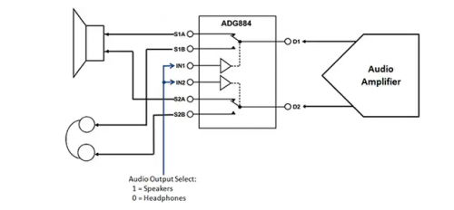 ADG884 可通過開關(guān)處理 400 mA 電流,因而適合從音頻放大器直接驅(qū)動揚(yáng)聲器(圖 2)。