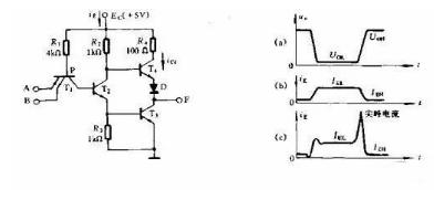輸出級的 T3、T4 管短設(shè)計(jì)內(nèi)同時(shí)導(dǎo)通。在與非門由輸出低電平轉(zhuǎn)向高電平的過程中,輸入電壓的負(fù)跳變在 T2 和 T3 的基極回路內(nèi)產(chǎn)生很大的反向驅(qū)動(dòng)電流,由于 T3 的飽和深度設(shè)計(jì)得比 T2 大,反向驅(qū)動(dòng)電流將使 T2 首先脫離飽和而截止。T2 截止后,其集電極電位上升,使 T4 導(dǎo)通?墒谴藭r(shí) T3 還未脫離飽和,因此在極短得設(shè)計(jì)內(nèi) T3 和 T4 將同時(shí)導(dǎo)通,從而產(chǎn)生很大的 ic4,使電源電流形成尖峰電流。圖中的 R4 正是為了限制此尖峰電流而設(shè)計(jì)。