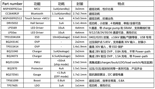 與充電盒的設(shè)計(jì)相比,耳機(jī)端的空間更小,對(duì)芯片的封裝和功耗提出了更嚴(yán)格的要求。針對(duì)這種情況,TI在耳機(jī)端的方案匯總?cè)缦拢?/font>